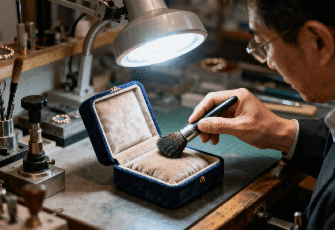 - Avoid direct sunlight: UV rays fade velvet colors quickly. Store boxes in a dark cabinet or wrap them in acid-free tissue paper (regular tissue may contain dyes that transfer) if displayed on a vanity.